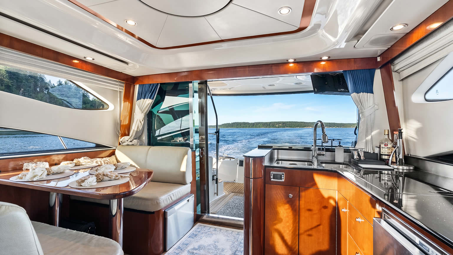 The Meridian 541 SD Galley with Dinette is a beautifully designed space that is both functional and stylish. This area of the yacht is perfect for entertaining guests or preparing meals for the family. The galley is equipped with top-of-the-line appliances, including a large refrigerator, oven, and stovetop, ensuring that you have everything you need to prepare gourmet meals at sea. The ample counter space provides plenty of room for food preparation, and the spacious dinette provides seating for enjoying meals and socializing with guests. The dinette features a large, comfortable booth-style seating area that can accommodate several people. The area is surrounded by large windows, providing plenty of natural light and stunning views of the surrounding waters. The high-end finishes, including beautiful wood cabinetry, granite countertops, and premium flooring, add to the overall elegance and sophistication of the space. Whether you're preparing a quick snack or a full-course meal, the Meridian 541 SD Galley with Dinette provides the perfect setting for culinary adventures on the water. The combination of functionality, style, and comfort makes this area a standout feature of the yacht.
