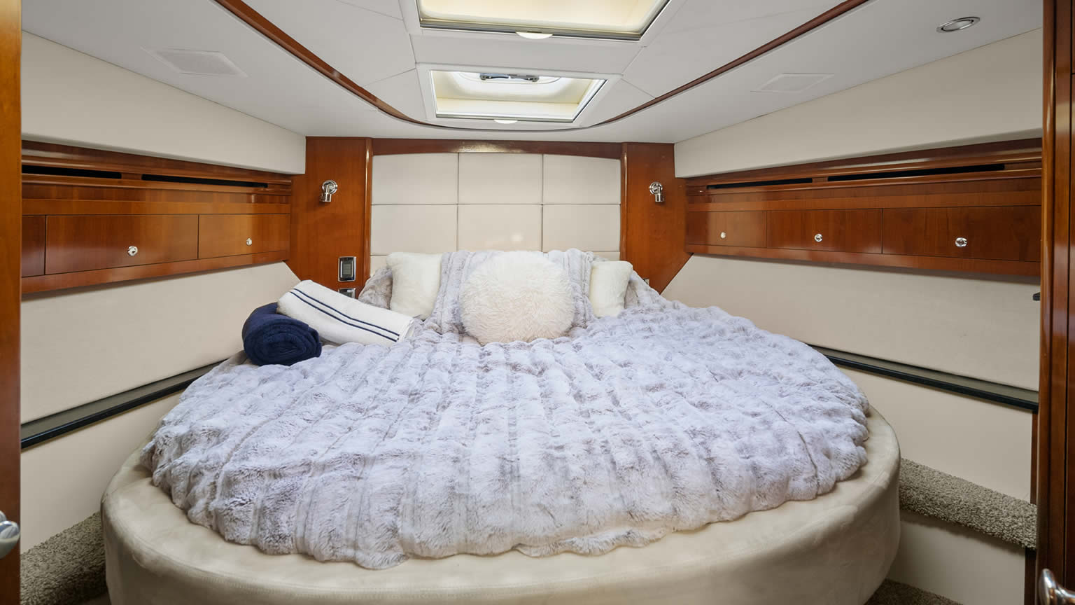 The master stateroom in the Meridian 541 boat is a luxurious and spacious retreat for the captain and owner of the vessel. Designed for ultimate comfort and relaxation, this stateroom boasts elegant and modern furnishings that are both functional and stylish. As you step inside, you will be greeted by a large and comfortable king-sized bed with plush bedding and pillows. The bed is framed by beautiful hardwood cabinetry that adds warmth and sophistication to the space. The master stateroom is equipped with large windows that let in an abundance of natural light and provide stunning views of your surroundings. The stateroom is air-conditioned, making it the perfect escape from the heat of the sun. For your entertainment, there is a flat-screen TV with Satellite DirectTV mounted on the wall, and a premium sound system that allows you to enjoy your favorite music and movies in comfort. There is also a generous amount of storage space, including cedar-lined closets and under-bed drawers, so you can pack all your essentials for your journey. The ensuite bathroom in the master stateroom is nothing short of magnificent, with a spacious shower, vanity, and plenty of storage space for your personal items. The bathroom is finished with high-end fixtures, including a mirrored medicine cabinet, and a countertop made of solid surface materials. In short, the master stateroom in the Meridian 541 boat is the perfect retreat for those who demand the very best in comfort, style, and luxury. Whether you're cruising the open seas or anchored in a quiet cove, this stateroom will provide you with the perfect haven of peace and tranquility.